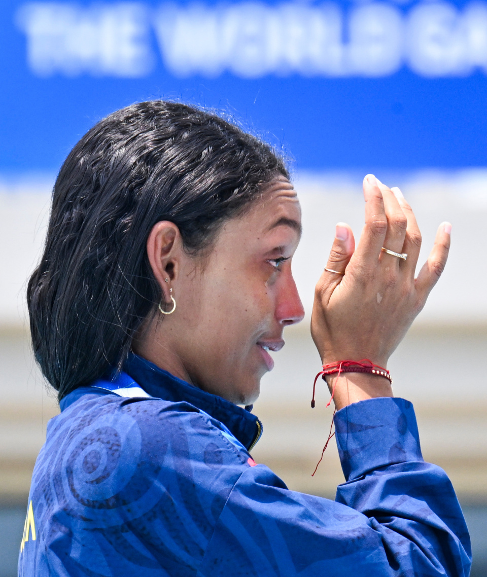 8月12日,冠军哥伦比亚选手蒂姆斯· 阿丽萨在颁奖仪式上流泪。新华社记者 谢剑飞 摄